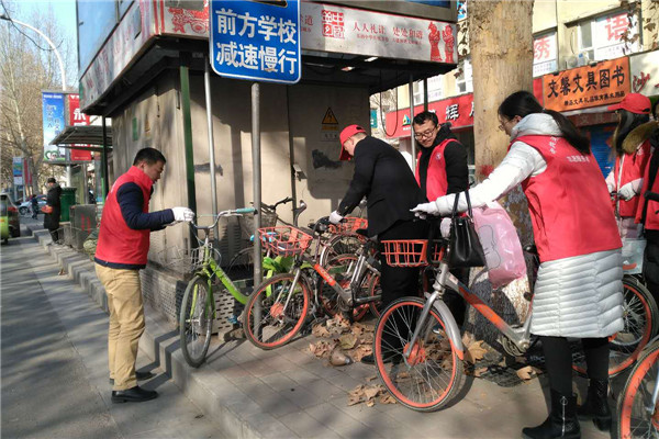 志愿者們冒著寒風(fēng)和低溫,清理家屬院里違規(guī)停放小黃車,并引導(dǎo)社區(qū)居民講文明、樹新風(fēng),養(yǎng)成良好的行為習(xí)慣。經(jīng)過一個多小時的勞動,雖然手都凍紅了,但看到近百輛擺放的整整齊齊的單車和井然有序的院子,大家都有滿滿的成就感,也體會到了奉獻的快樂。