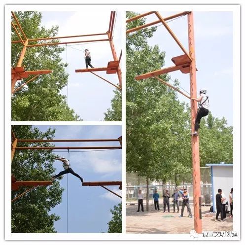 從一開始的團(tuán)隊(duì)破冰,到考驗(yàn)智慧和勇氣的互動(dòng)游戲,大家相互配合、彼此信任,英姿颯爽、奮力拼搏。在“高空斷橋”項(xiàng)目中,隊(duì)員們爬上8米高空,躍過(guò)斷橋后折回,再?gòu)目罩薪德?。?dāng)有隊(duì)員面對(duì)高空遲疑害怕時(shí),其他隊(duì)員都紛紛加油鼓勁,耐心等待,傳遞著集體溫暖的力量,最終所有隊(duì)員都順利完成了挑戰(zhàn)。