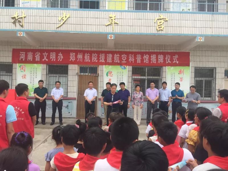 7月11日,河南省委宣傳部常務(wù)副部長蘇長青、副部長張曼如、省文明辦專職副主任王飛等同志帶領(lǐng)部機關(guān)有關(guān)人員,與鄭州航空管理學(xué)院有關(guān)領(lǐng)導(dǎo)和志愿者師生一行,分別到省委宣傳部幫扶貧困村周口市西華縣半截樓村和漯河市舞陽縣余莊村,為省文明辦、鄭州航院援建的航空科普館和鄭州航院志愿服務(wù)基地舉行揭牌儀式。